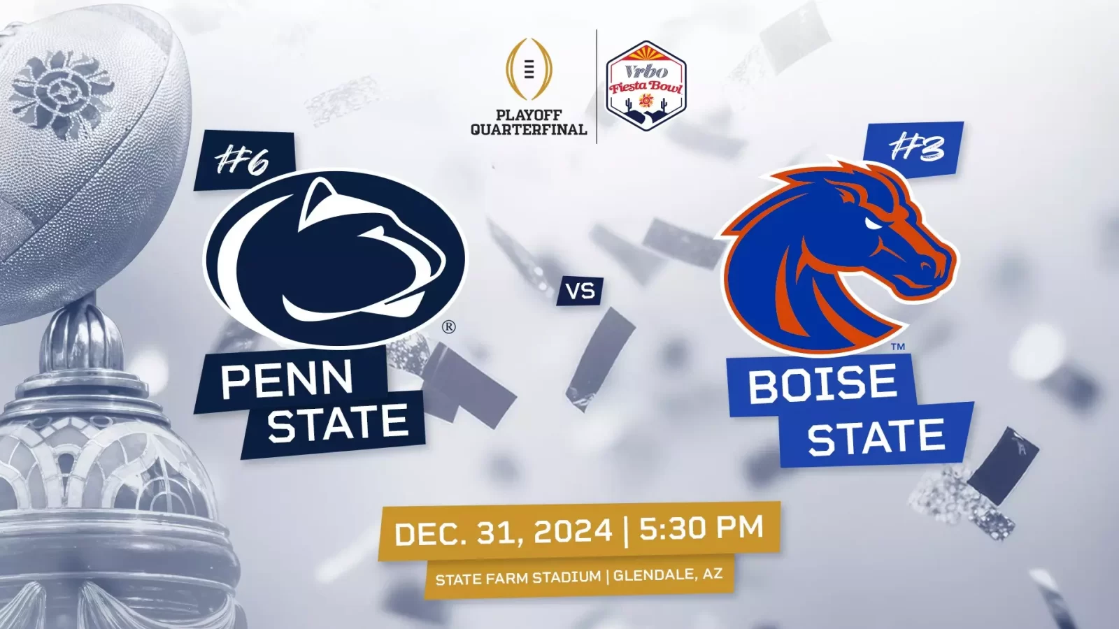 První čtvrtfinálový zápas přinese zajímavé střetnutí favorita z Penn State, který vyráží na dlouhou cestu do Glendale, kde je čeká Boise State. Velkou otázkou je aktuální forma Boise State, kteří mají za sebou delší pauzu. Naposledy nastoupili 6. prosince v šampionátu Mountain West.